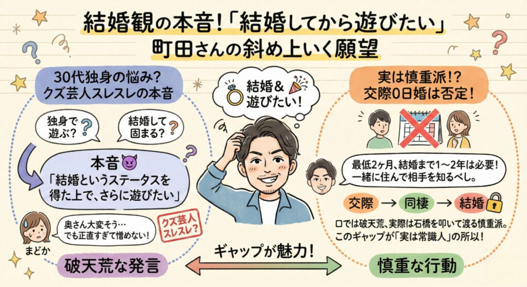 「結婚して身を固めたい」でも「独身で自由に遊びたい」でもなく、「結婚というステータスを得た上で、さらに遊びたい」という、一歩間違えれば大炎上しかねないクズ芸人スレスレの願望。
